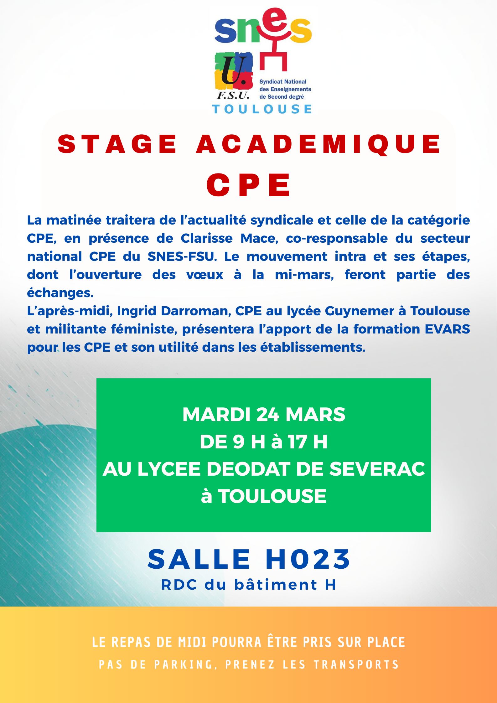 – la matinée sera consacrée à l’actualité syndicale et à celle de la catégorie CPE. Nous accueillerons Clarisse MACE, co-reponsable du secteur national CPE du SNES-FSU. Nous pourrons aborder les questions académiques et notamment le mouvement INTRA dont la saisie des vœux commencera vers la mi-mars.