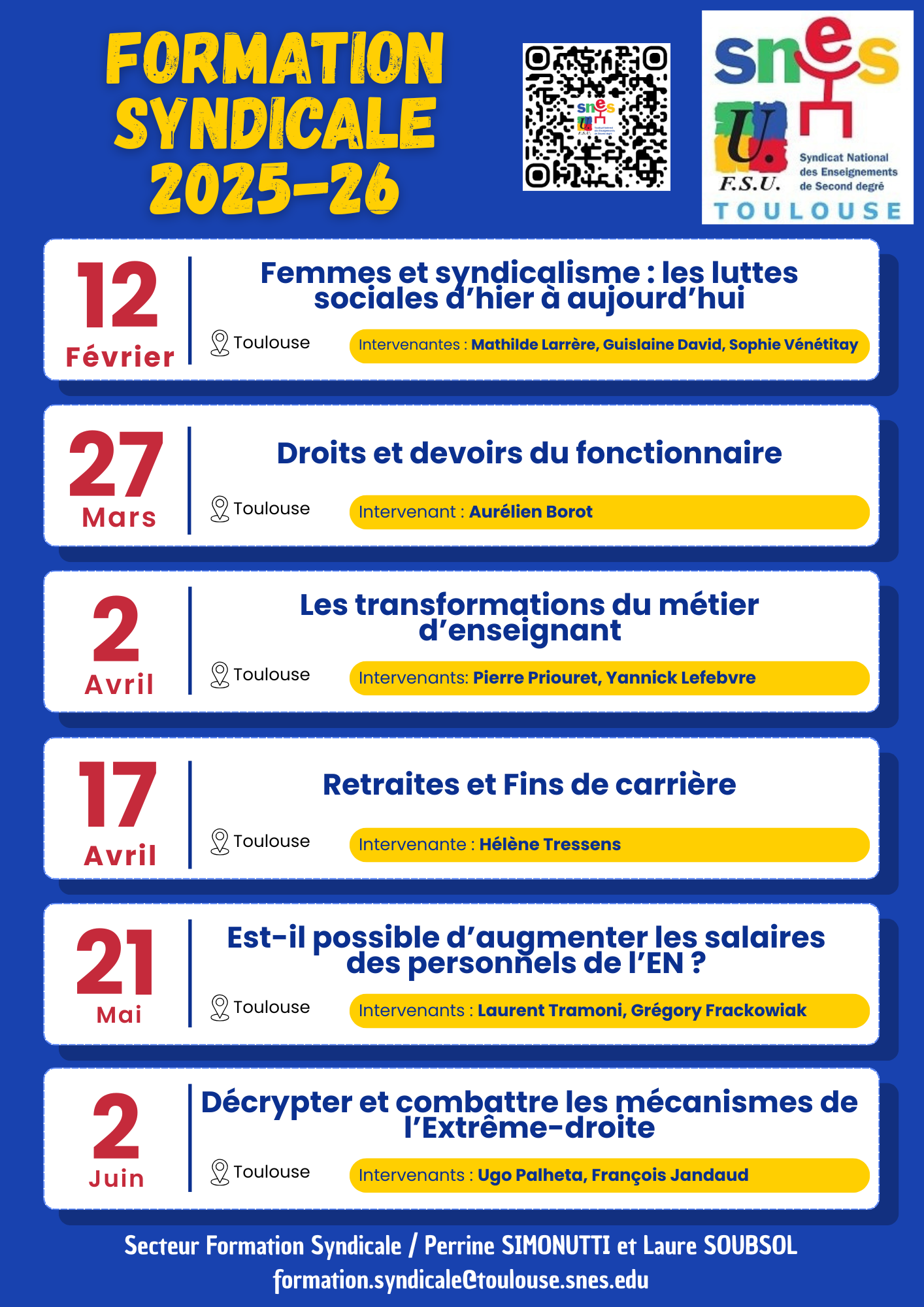 – Stage spécial Retraites et Fins de carrières, le vendredi 17 avril, à Toulouse, au lycée Déodat de Séverac.